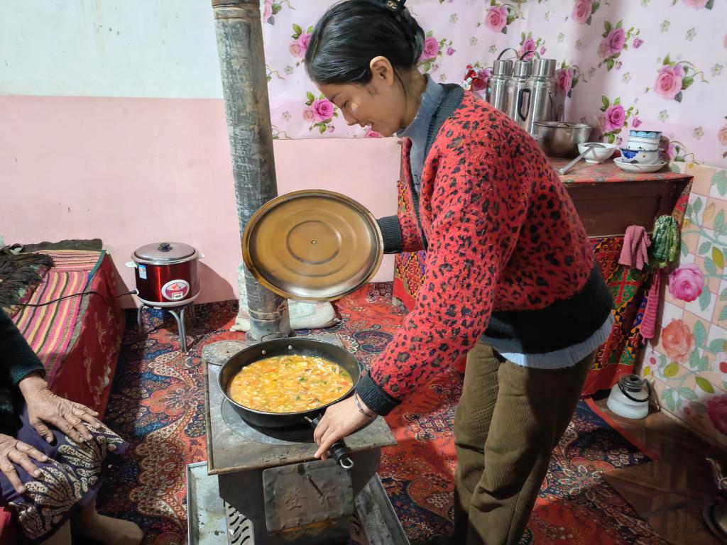 哈拉峻鄉的一位居民正在做晚飯。新華社記者於濤 攝