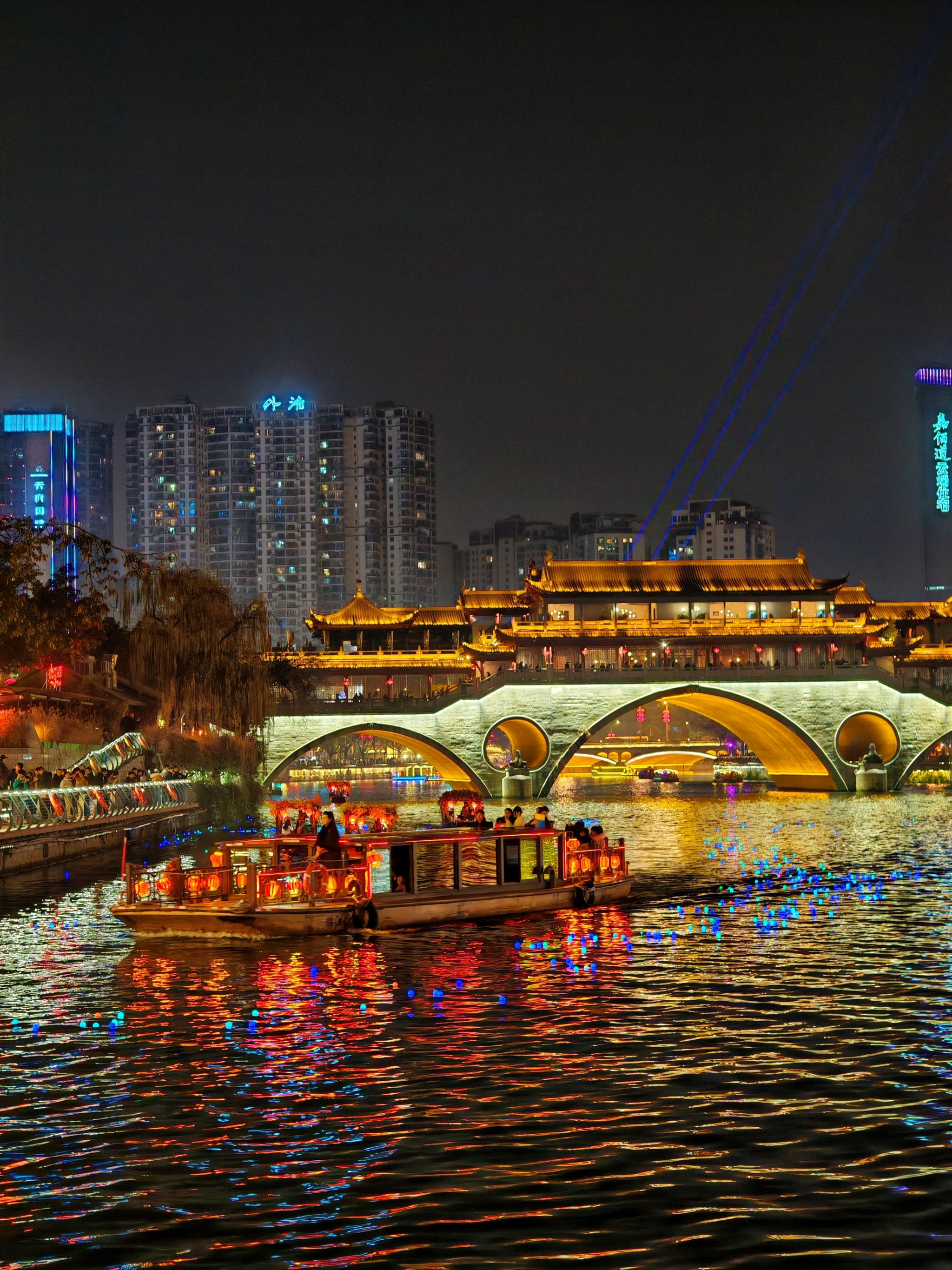 遊船向夜色深處漫溯,光影璀璨間,千年水道煥發著新的生機與活力,描繪著新時代的“錦官城”。
