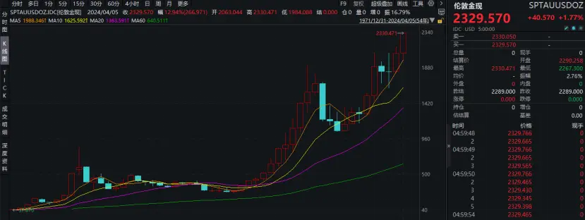 截至中國北京時間4月6日早間,紐約商品交易所6月交收的黃金期貨合約收報2349.1美元/盎司,當日上漲40.6美元或1.76%。倫敦現貨金收報2329.57美元/盎司,漲幅為1.77%。國際金價續創歷史新高,年內漲幅已達13%。