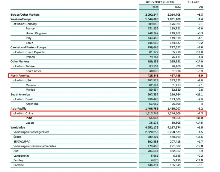 儘管大眾汽車集團全球總交付量實現增長,但銷量結構的變化和外部環境變化成為了其利潤下滑的關鍵因素。從區域表現來看,大眾汽車的區域銷售呈現冰火兩重天。歐洲及其他地區增長3.3%,南美市場大漲21.1%。但關鍵市場表現疲軟,北美地區銷量下滑6.9%;在最重要的單一市場中國,大眾乘用車與輕型商用車交付量同比下降2.3%。
