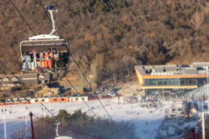 圖為遊客在東北亞國際滑雪場乘坐纜車。