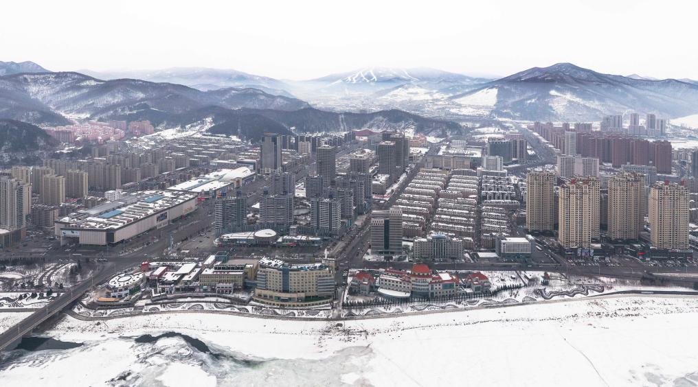 吉林省通化市城區和遠處的萬峰通化滑雪度假區。