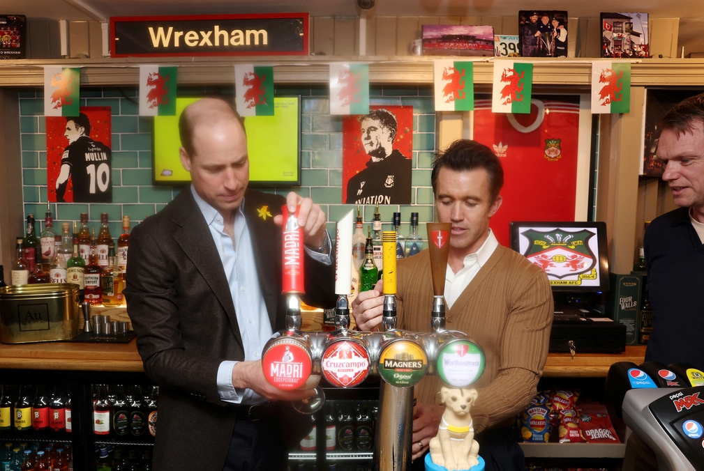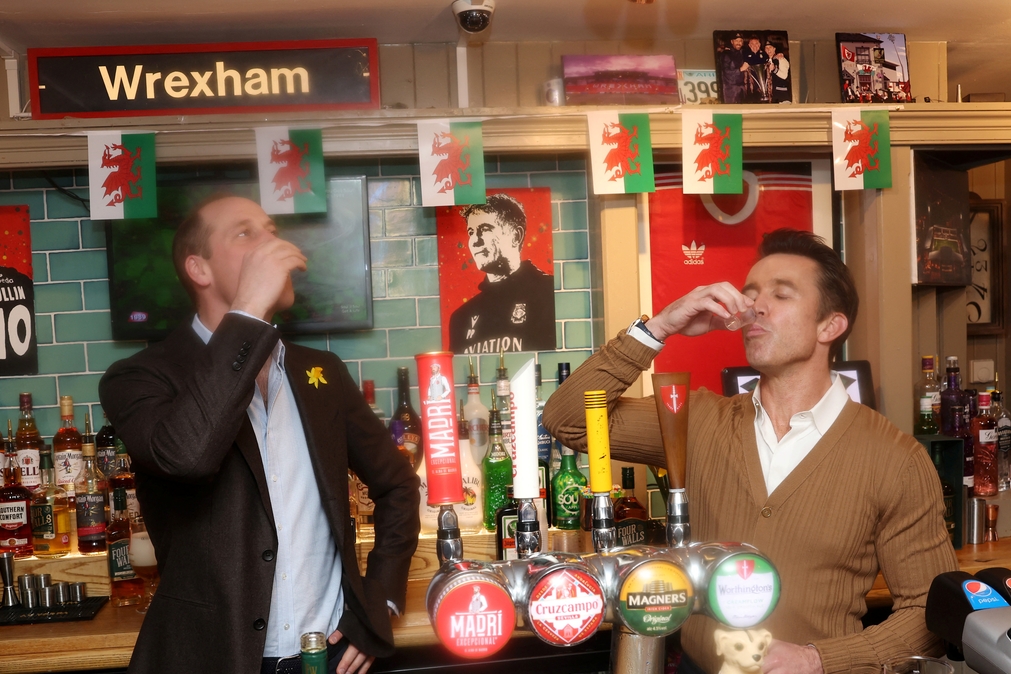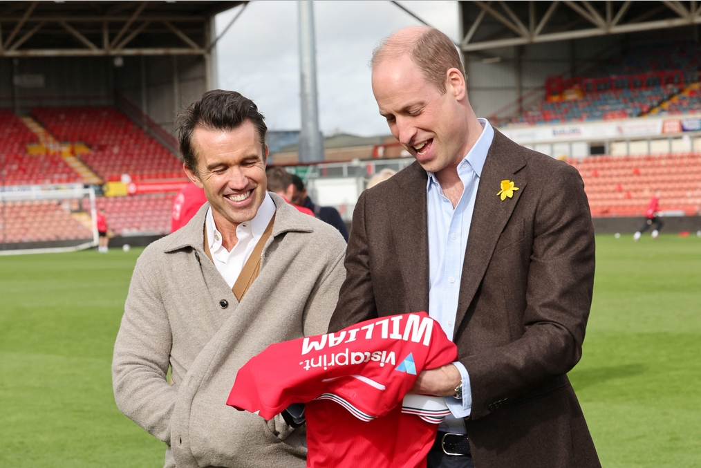 威爾士親王威廉正在雷克瑟姆訪問,以紀念威爾士守護神聖大衛日,並想聽聽麥克埃倫尼和《死侍》男主角瑞安-雷諾茲所擁有的俱樂部對當地社區的影響。他和麥克埃倫尼在雷克瑟姆賽馬場旁邊的草皮酒吧裏斟酒時說:”我喜歡蘋果酒。“王子後來在那裏得到了一件背後印有他名字的球衣。