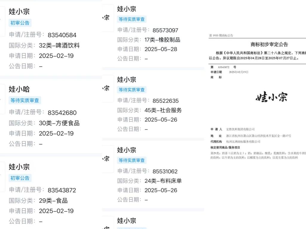 記者搜索發現,宏勝飲料集團有限公司在2025年2月至5月申請註冊了幾十個“娃小宗”的商標,狀態大多處於“等待實質申請”,但商標國際分類32類啤酒飲料、29類食品、30類方便食品的商標申請已完成初步審定。此外,宏勝飲料集團有限公司還在2025年2月申請了“宗小哈”“娃小哈”等商標。