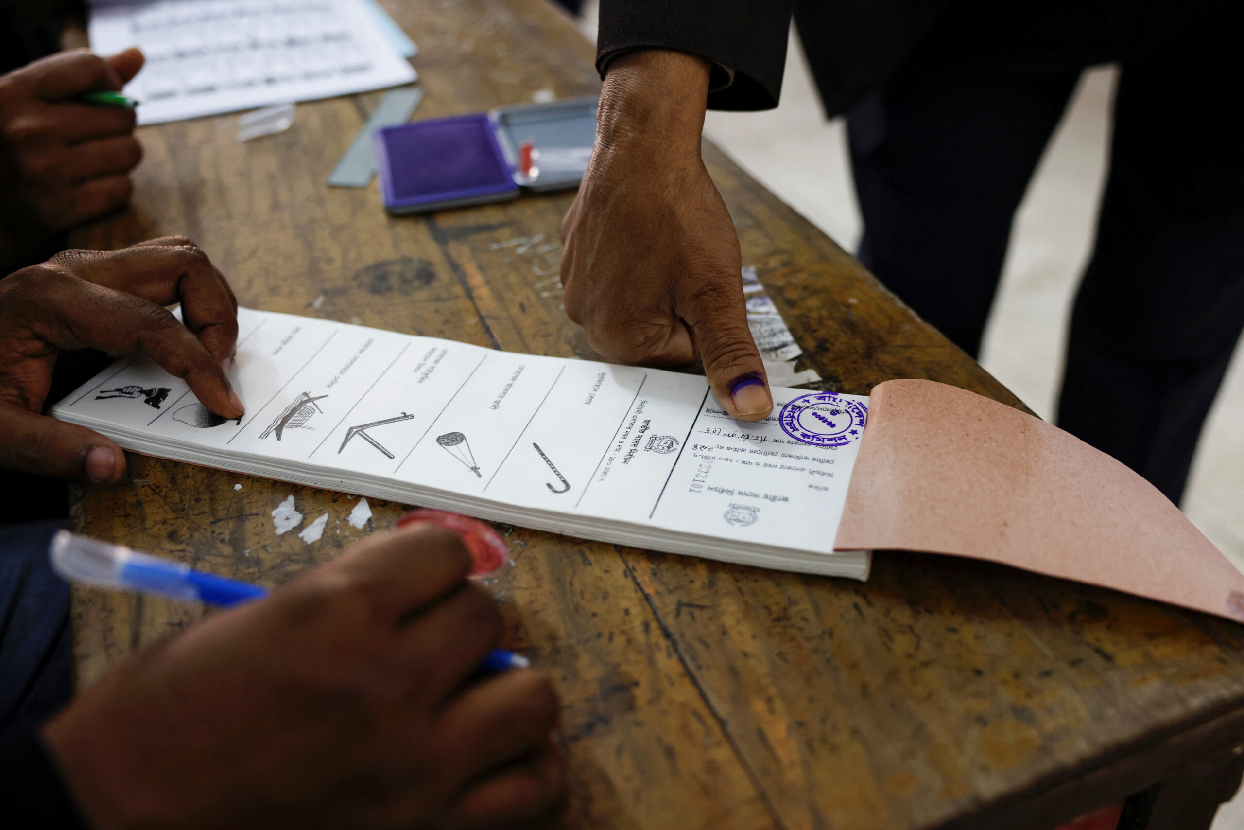 An officer instructs a voter to go to a designated area to cast vote during the 12th general election in Dhaka, Bangladesh, January 7, 2024. REUTERS/Mohammad Ponir Hossain
