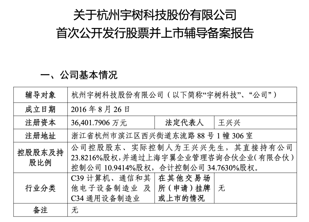 根據輔導備案報告,宇樹科技控股股東、實際控制人為王興興,王興興直接持有23.8216%股權,並通過上海宇翼企業管理諮詢合夥企業(有限合夥)控制公司10.9414%股權,合計控制公司34.763%股權。