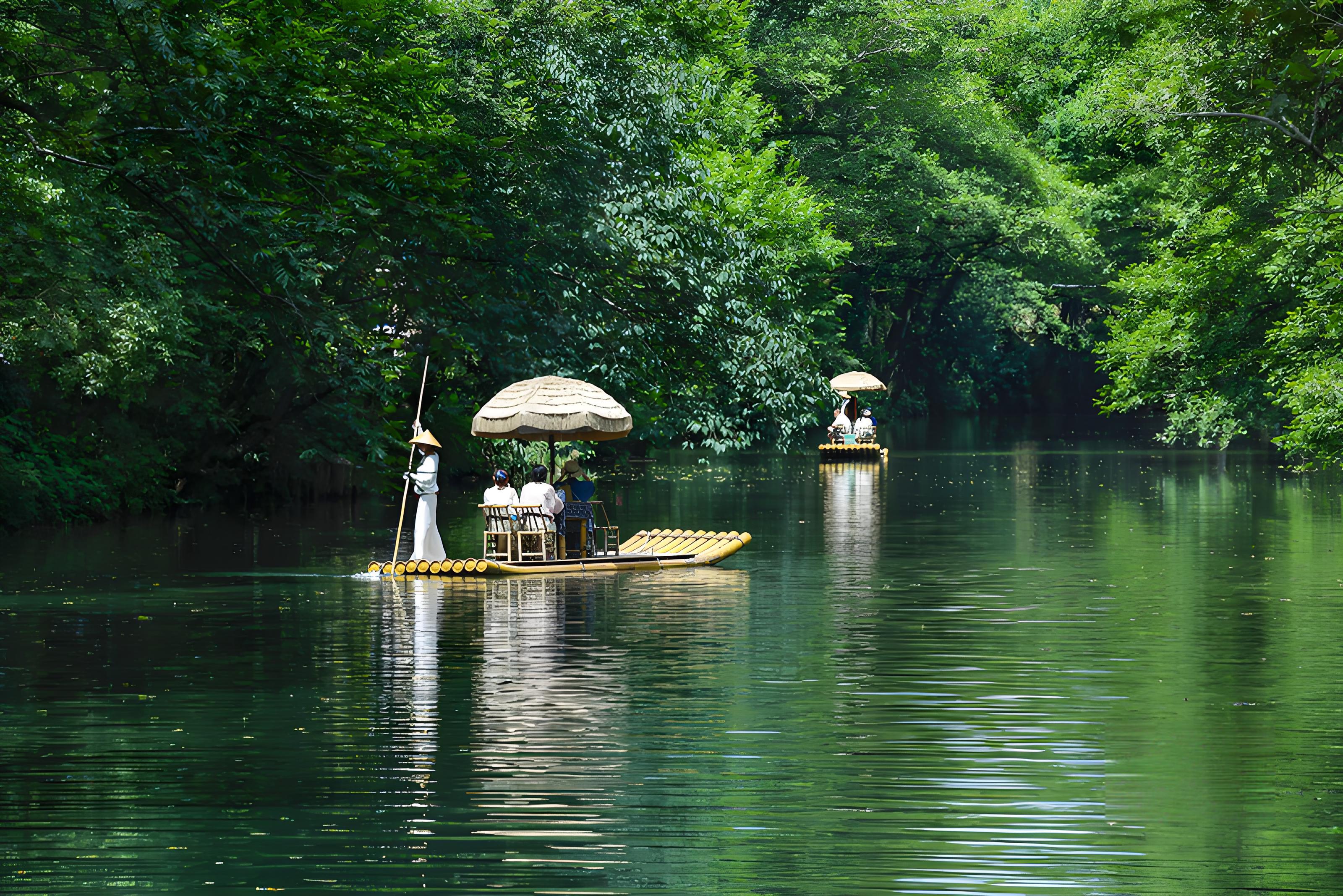 當日,安徽省黃山市徽州區西溪南古村落風景旖旎,連綿的楓楊林蒼翠欲滴,蜿蜒的豐樂河碧波蕩漾,如詩如畫的生態美景吸引眾多遊客前來遊玩。
