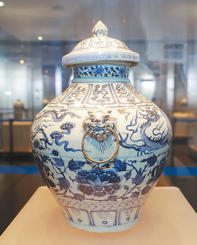 移步博物館元代窖藏廳,青花雲龍紋獸耳銜環蓋罐便映入眼簾。釉色白中閃青,釉質瑩潤,紋飾多達12層,主體紋飾是雲龍紋和纏枝牡丹紋,青花色澤蒼翠濃豔,紋飾運筆酣暢有力。