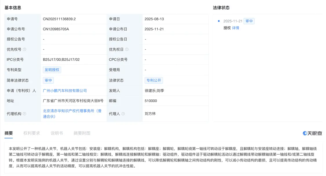 11月26日,天眼查顯示,近日,廣州小鵬汽車科技有限公司申請的“機器人關節”專利獲授權。 摘要顯示,本發明的機器人關節包括:安裝座;解耦機構。根據本發明實施例的機器人關節,通過設置分別與解耦輪和解耦軸連接的解耦線,可以降低解耦輪和解耦軸之間傳動結構的剛性,可以減小傳動結構的磨損,且可以提高傳動結構的傳動精度,從而可以提高機器人關節的活動精度,可以提高機器人關節的抗衝擊性能。 <img class="alignnone size-full wp-image-77651" src="http://skyeconews.com/wp-content/uploads/2025/11/1-185.webp" alt="" width="1125" height="95" /> <img class="alignnone size-medium wp-image-77652" src="http://skyeconews.com/wp-content/uploads/2025/11/110-12.webp" alt="" width="1125" height="609" /> 來源:中國鳳凰科技網 來源:中國鳳凰科技網