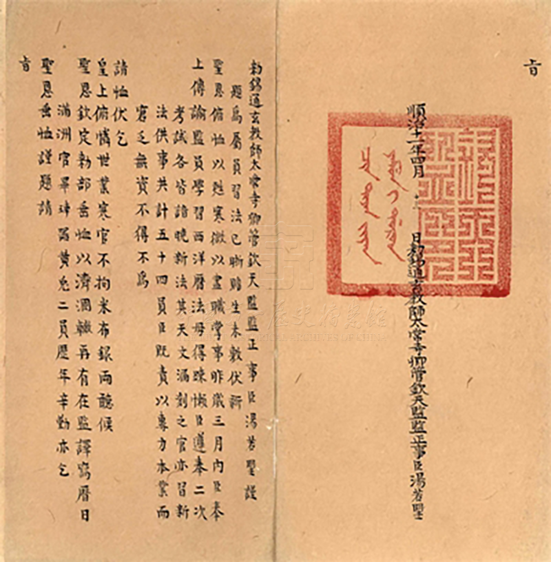 中國第一歷史檔案館藏的一件順治十一年(1654 年)的題本檔案中,欽天監監正湯若望稱 :“恭照皇上特用新法推造時憲曆,日已成一代巨典。”順治帝傳諭 :“監員學習西洋曆法,毋得悚懶”等內容。重視欽天監和推行曆法已然成為順治帝表明政治態度的一個重要風向標。然而,順治帝逝後,康熙四年(1665 年),鼇拜等製造了曆法之爭——“湯若望案”。