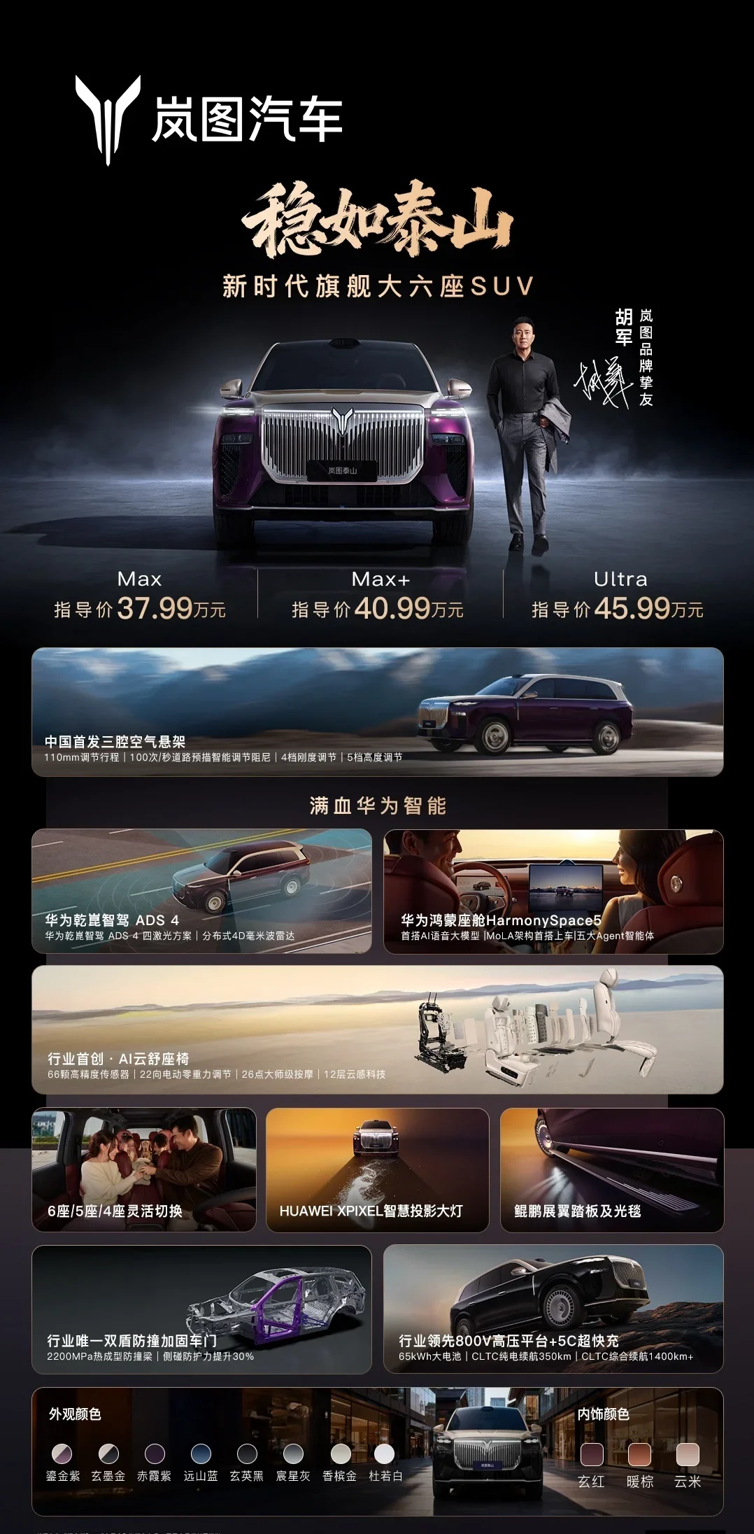 11 月 18 日消息,嵐圖泰山旗艦 SUV 今日正式上市,新車搭載華為乾崑智駕 ADS 4 + 鴻蒙座艙 5、超感 AI 雲舒零重力座椅(22 向電動零重力調節)、32 揚聲器天籟全景音響等,並華系首搭三腔空懸,售價 37.99 萬元起。