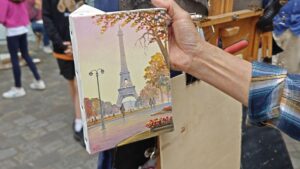 他攤位裏的畫不多,內容均是旁邊的教堂以及埃菲爾鐵塔,筆觸精細,色調溫暖。
