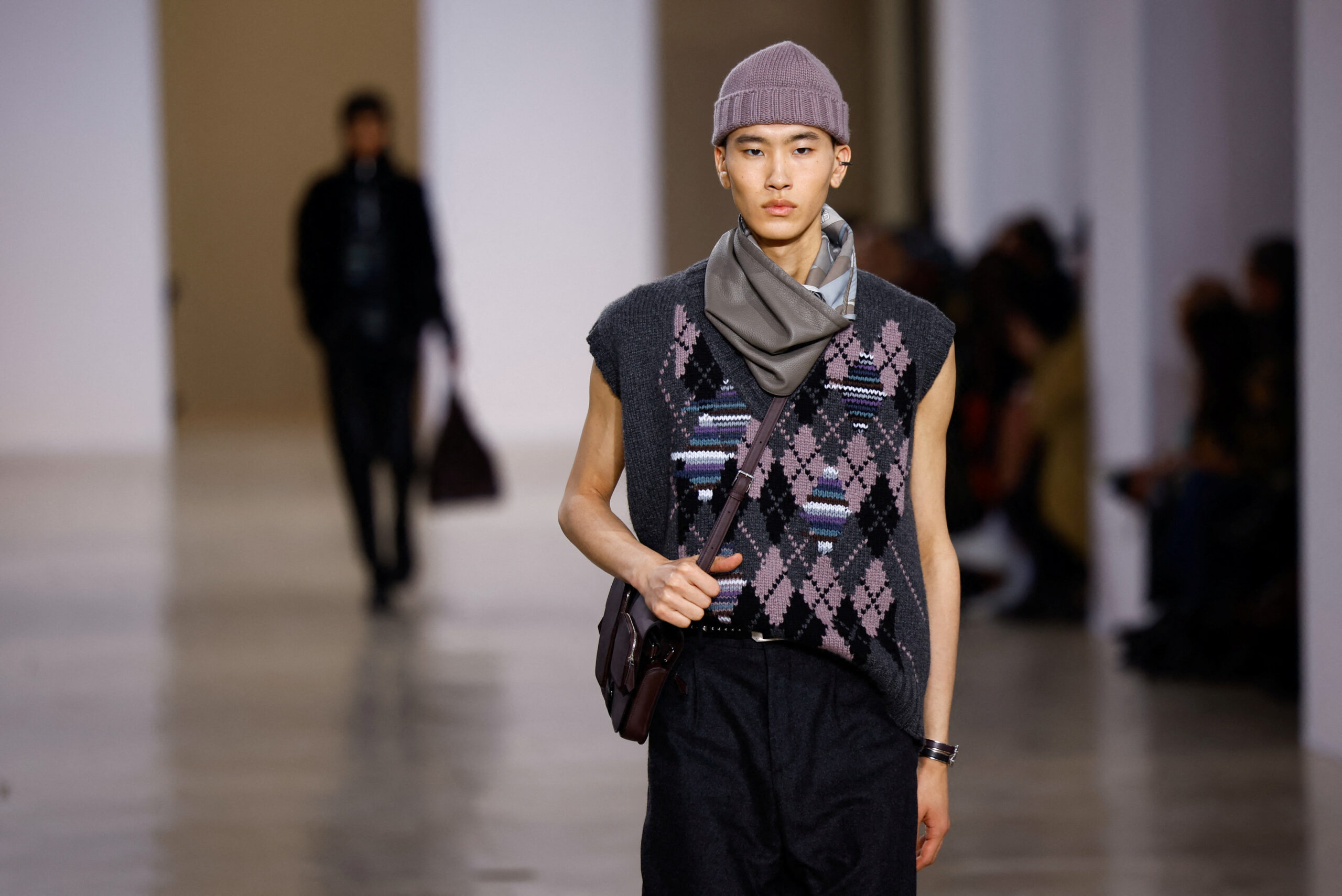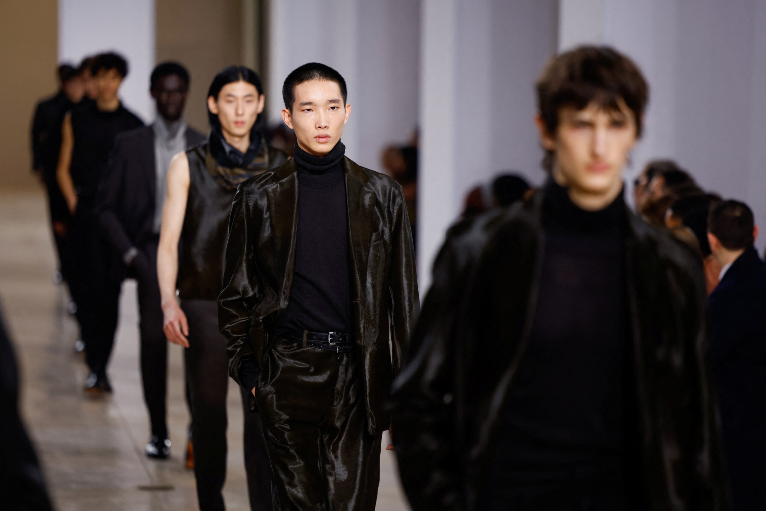 優雅的服裝包括一套裁剪整齊的套裝,由拋光的小牛皮製成,在燈光下閃閃發光。巴黎時裝周的秋冬男裝秀將持續到周日,展示業內最大的品牌,包括華倫天奴和巴爾曼、路威酩軒集團旗下的迪奧和路易威登,以及數十個較小的品牌,包括Ami、Sean Suen和LGN Louis Gabriel Nouchi。