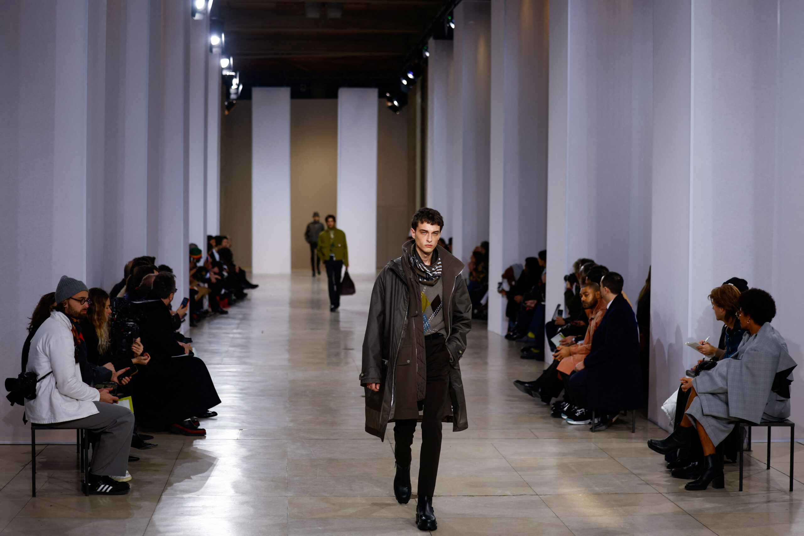 A model presents a creation by designer Veronique Nichanian as part of her Men’s Winter 2024 collection at the runway show for fashion house Hermes during Men’s Fashion Week in Paris, France, January 20, 2024. REUTERS/Sarah Meyssonnier
