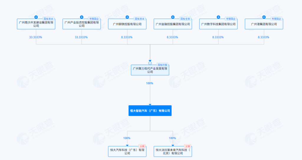 11月21日,據天眼查披露的資訊顯示,恒大智能汽車(廣東)有限公司、恒大新能源汽車(廣東)有限公司近日發生工商變更,原股東恒大新能源汽車投資控股集團有限公司退出,新增廣州聚力現代產業發展有限公司(以下簡稱“廣州聚力”)為控股股東。