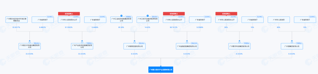 其中,廣州南沙開發建設集團由廣州南沙經濟技術開發區管理委員會和廣東省財政廳持股,持股比例分別為93.5017%和6.4983%。而廣州產業投資集團由廣州市人民政府辦公廳和廣東省財政廳分別持股91.5502%和8.4498%。
