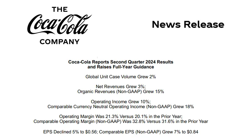 週二(7月23日)美股盤前,可口可樂公司發佈了2024年第二季度財報,不僅營收和每股收益雙超市場預期,還上調了全年業績的預測。