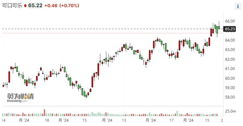 可口可樂在財報中預計,今年的有機收入增速在9%到10%之間,高於4月份預測的8%到9%。受這些因素的提振,可口可樂股價早盤一度創下新高每股66.04美元。
