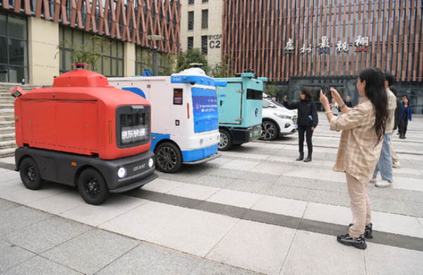 在重慶永川大數據產業園拍攝的對外展示的無人駕駛環衛車、無人配送車等智能車輛。近年來,重慶市永川區在智能汽車產業鏈發展、應用場景拓展、城市配套設施提升等方面都取得了新的突破,圍繞實施單車智能和車路協同兩條技術路線快速融合,加強車路雲協同技術發展,著力打造西部自動駕駛開放測試和示範運營基地。