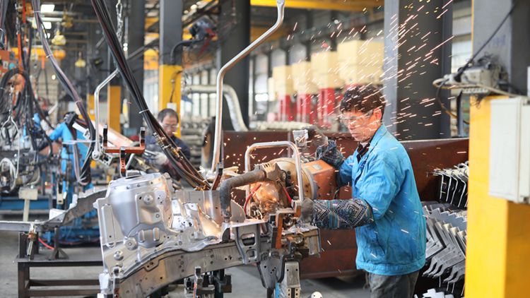 安徽省合肥市肥西縣桃花鎮一家機械企業生產車間,工人在生產汽車零配件。
