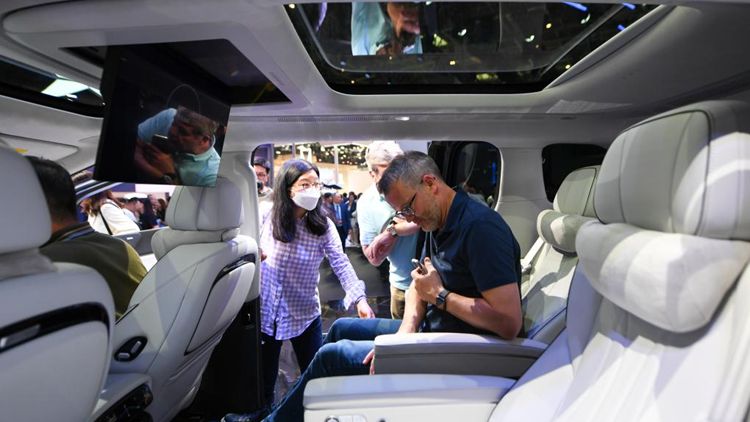 參觀者觀看一款新能源汽車的智能車控系統演示。