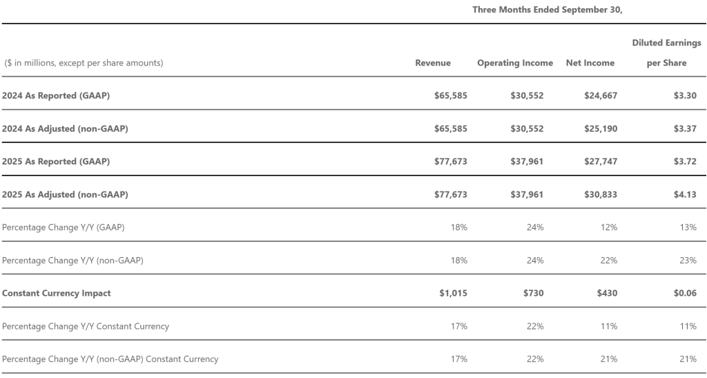 當地時間10月29日,微軟公佈截至2025年9月30日的2026財年第一財季業績,第一財季營收776.73億美元,高於市場預期的753億美元,同比增長18%;淨利潤同比增長12%至277.47億美元;攤薄後每股收益3.72美元,高於市場預期的3.67美元。