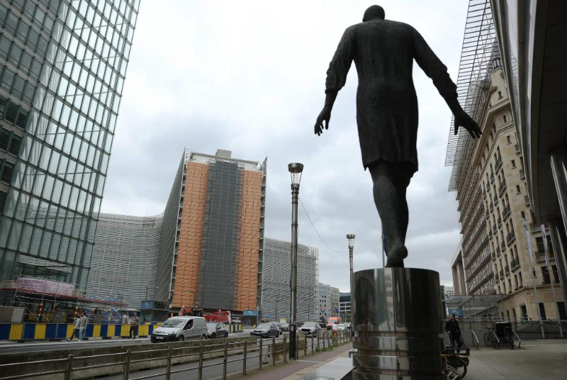 在比利時布魯塞爾,車輛駛過歐盟委員會大樓。