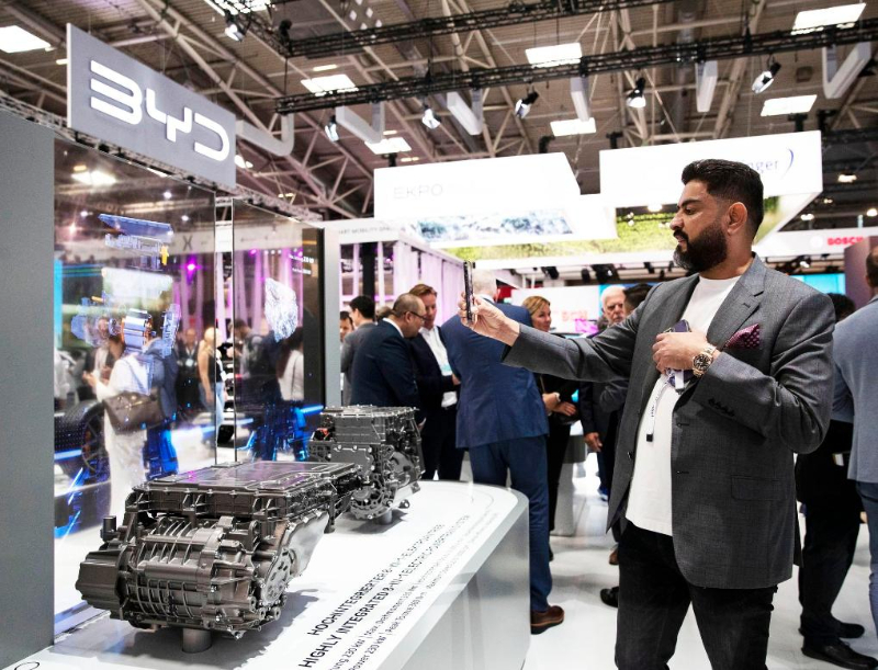 一名參觀者在德國慕尼克國際車展媒體預展上拍攝比亞迪的展品。