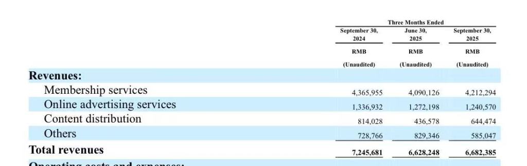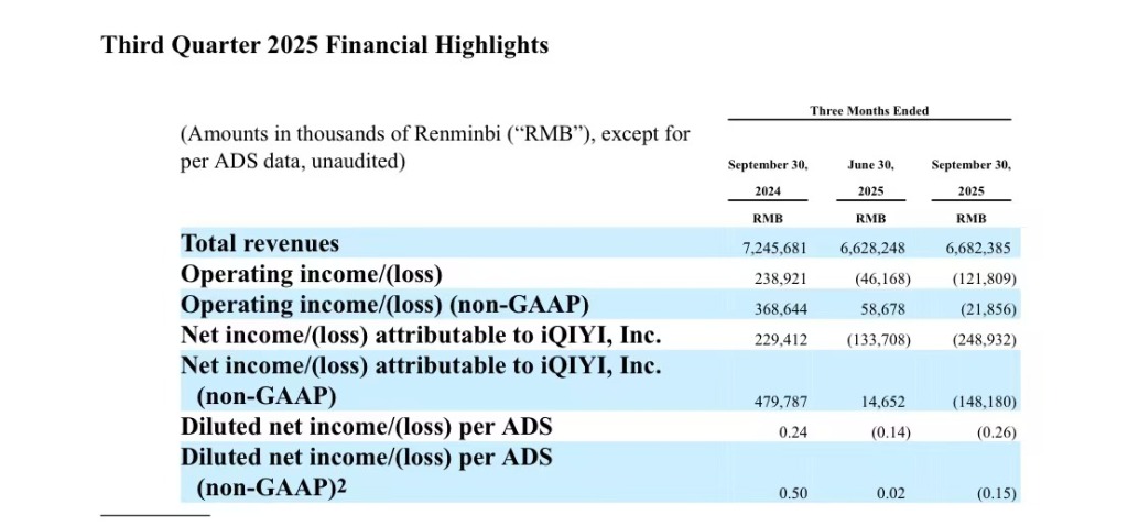 11月18日,愛奇藝公佈2025年第三季度財報。該季度愛奇藝實現營業收入66.8億元,同比下降約8%,環比增長1%;不按美國通用會計準則,歸屬於愛奇藝的淨虧損為1.482億元,而上年同期淨利潤為4.798億元。