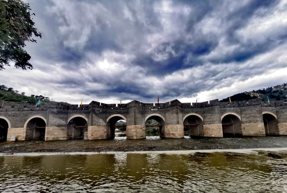 九門口長城的過河城橋獨具特色,在百餘米寬的河道上,用巨型條石砌起8個梭形橋墩,與兩側的圍牆一起形成9個水門。梭形橋墩的設計能夠形成交叉火力,增加了防禦面積,又能起到一個水壓分流的作用。