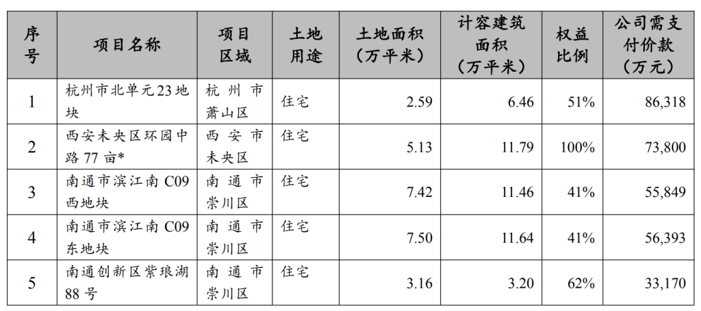 其中,杭州市北單元23地塊位於杭州市蕭山區,土地面積2.59萬平方米,計容建築面積6.46萬平方米,需支付價款86318萬元,權益比例為51%。