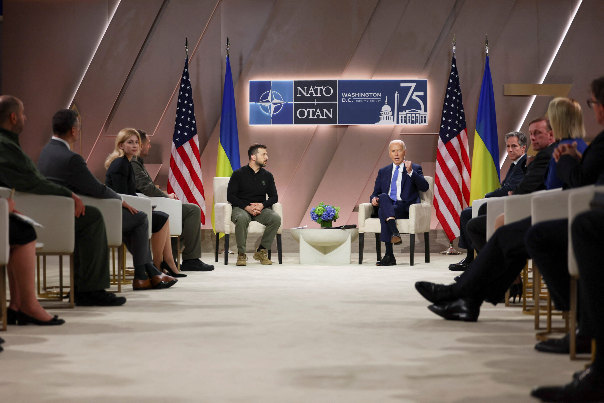 美國總統喬·拜登在華盛頓北約峰會上舉行雙邊會談之前對澤倫斯基說:“我們將與你們在一起,永遠如此。”