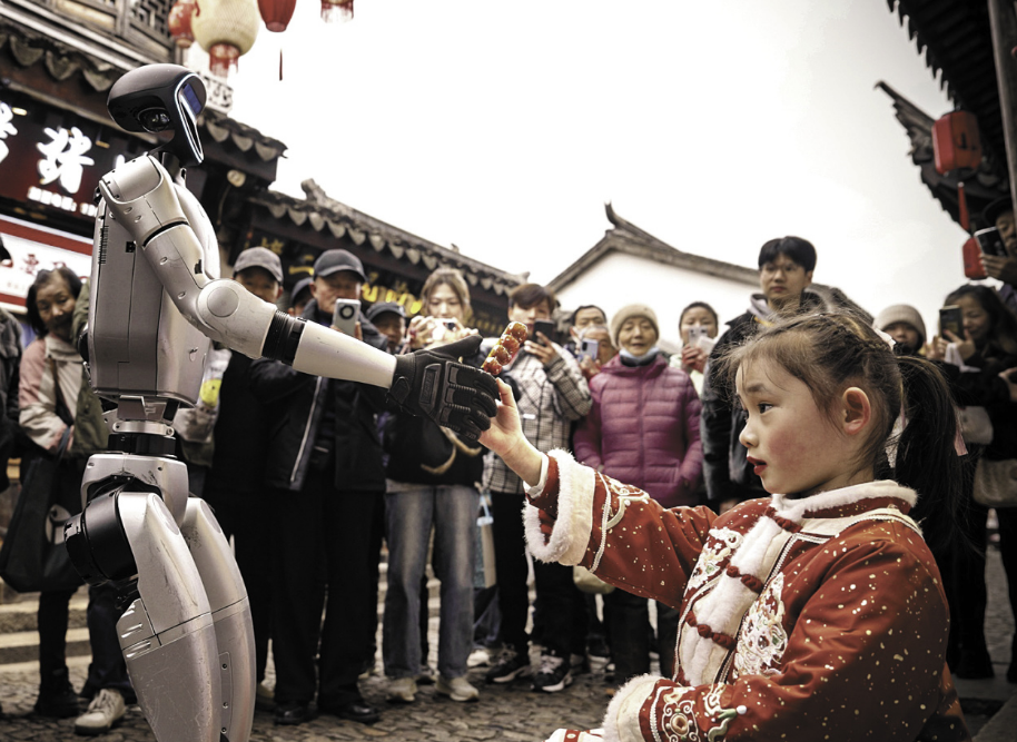 近日,上海嘉定南翔古鎮多出了很多機器人,唱歌、跳舞、巡邏、送餐,各種花式“整活”。這些機器人大部分來自智能製造與機器人國際聯創中心的入駐企業,遊客可以聽機器人唱歌、與機器人一同跳舞;企鵝機器人則在店鋪門口賣萌招攬顧客;央視春晚同款機器人也現身古鎮跟遊客打招呼。
