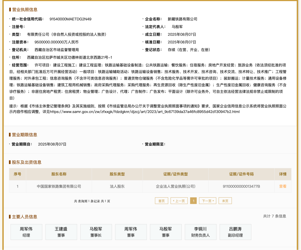 消息面上,據國家企業信用資訊公示系統顯示,8月7日,新藏鐵路有限公司成立,法定代表人為馬殷軍,註冊資本950億元。公司位於西藏自治區拉薩市,是一家以從事鐵路運輸業為主的企業。經營範圍含建設工程施工、建設工程監理、鐵路運輸基礎設備製造、公共鐵路運輸、餐飲服務、住宿服務、房地產開發經營、旅遊業務等。