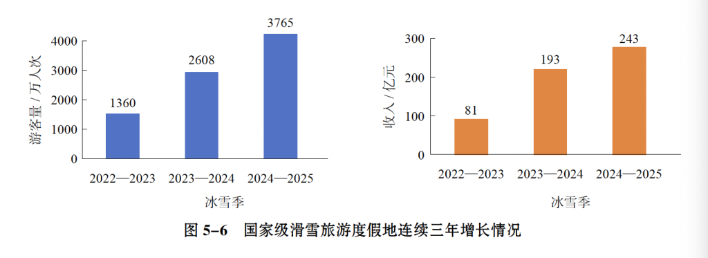 《報告》顯示,2024-2025冰雪季,我國26家國家級滑雪旅遊度假地接待人次和實現收入連續三個冰雪季實現快速增長。其中,接待滑雪旅遊總人次達2765萬,同比增長25%,旅遊總收入達243億元,同比增長34%。