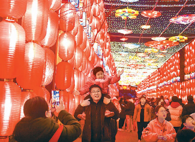 遊客在河北省正定古城南城牆欣賞新春花燈。