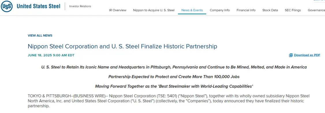 公告顯示,美國鋼鐵公司仍將是一家在美國註冊的實體,總部仍將設在賓夕法尼亞州匹茲堡;美國鋼鐵公司董事會的大多數成員將是美國公民;包括首席執行官在內的美國鋼鐵公司主要管理人員均為美國公民。