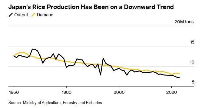 自20世紀60年代末以來,日本的大米產量其實就一直呈下降趨勢,部分原因是農業人口老齡化和政府政策鼓勵農民種植小麥等其他作物。不斷變化的氣候也引發了人們對產量和未來糧食安全的擔憂。