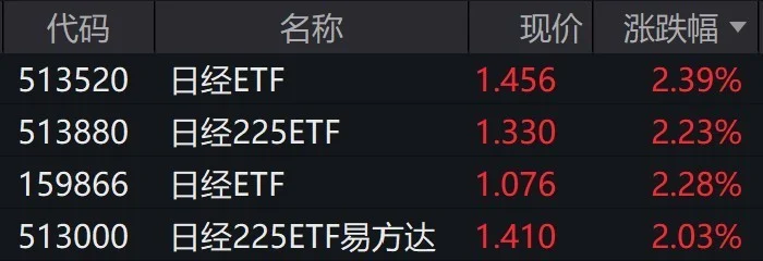日本股市週一大幅反彈,日經225指數早盤一度漲2.79%。 受盤面影響,場內4只日經225相關ETF普漲逾2%。 <img class="aligncenter wp-image-28421 size-full" src="https://skyeconomymedia.com/wp-content/uploads/2024/07/44DAE0F3EFEA6833AAF2839046EA0AC7294BAEA2_size21_w1080_h87-78.webp" alt="" width="700" height="240" /> 有市場分析認為,儘管投資者應該警惕日本央行今年任何一次會議的變動風險,但日本央行可能需要等到2024年末價格趨勢明朗後才會採取行動。預期日本的寬鬆環境將持續,這為企業提供了有利條件,並在實際利率仍為負的情況下提振了股市。 來源:每日經濟新聞
