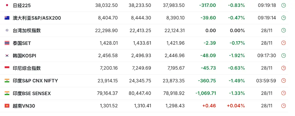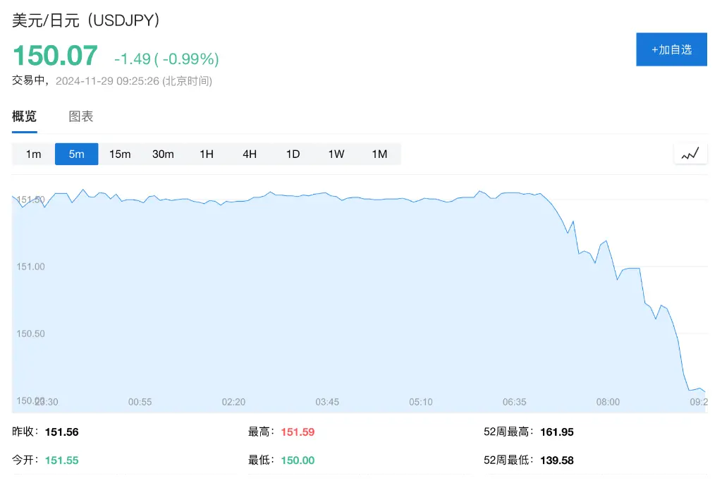 11月29日週五,亞太股市普跌,日韓股市雙雙下跌,日本11月東京CPI超預期上漲推動日元走強。 <img class="alignnone size-full wp-image-39811" src="http://skyeconews.com/wp-content/uploads/2024/11/04A89572F245DA06807140E4177D033F91B6A47A_size78_w900_h596-75.webp" alt="" width="1024" height="402" /> 日韓股市齊跌。日經225跌0.83%,韓國KOSPI指數跌1.92%。 受日本政府減少能源補貼推動,日本東京11月CPI升破2%超預期。數據公佈後,掉期市場定價日本央行在下個月加息的可能性超過50%,日元漲近1%,美元/日元盤中下破150關口,現報150.08。 日元持續走強,兌美元匯率漲破150關口。 <img class="alignnone size-full wp-image-39812" src="http://skyeconews.com/wp-content/uploads/2024/11/44DAE0F3EFEA6833AAF2839046EA0AC7294BAEA2_size21_w1080_h87-39.webp" alt="" width="1024" height="685" /> 來源:中國華爾街見聞