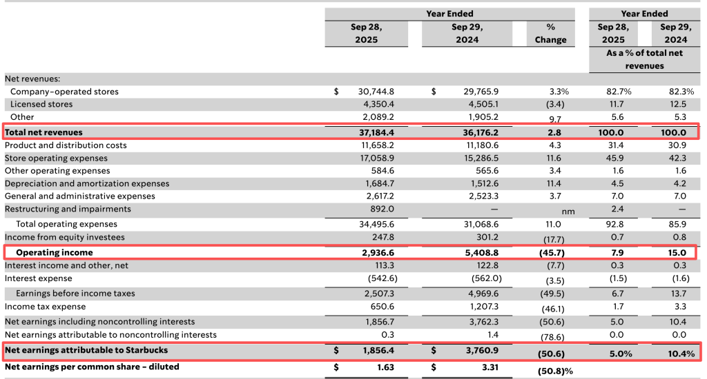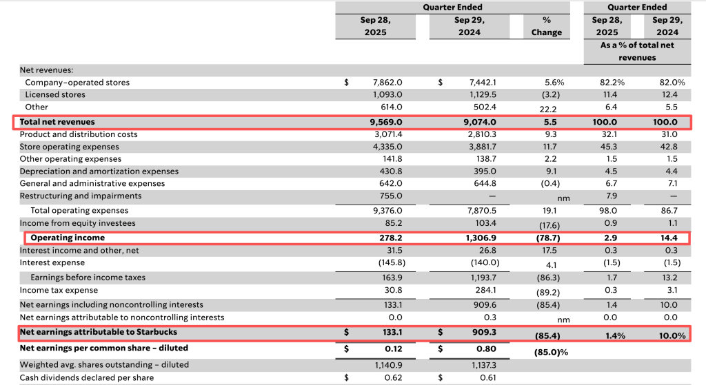 10月30日,全球連鎖咖啡星巴克(Nasdaq:SBUX)發佈截至2025年9月28日的2025財年第四財季及全財年業績報告。2025財年第四財季總淨收入為95.69億美元,同比增長5.5%,高於市場預期;實現營業利潤2.78億美元,同比下滑78.7%;實現歸母淨利潤為1.33億美元,同比下滑85.4%;每股收益調整後為52美分,低於市場預期。