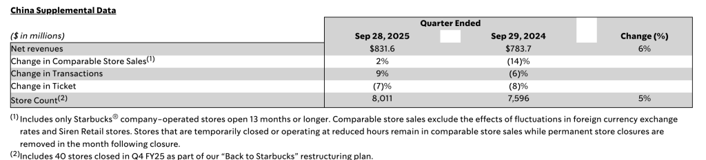 2025全財年中國市場收入達到31.05億美元,同比增長5%。中國同店銷售額下降1%,主要原因是平均客單價下降5%,部分被同店交易量增長4%所抵消。