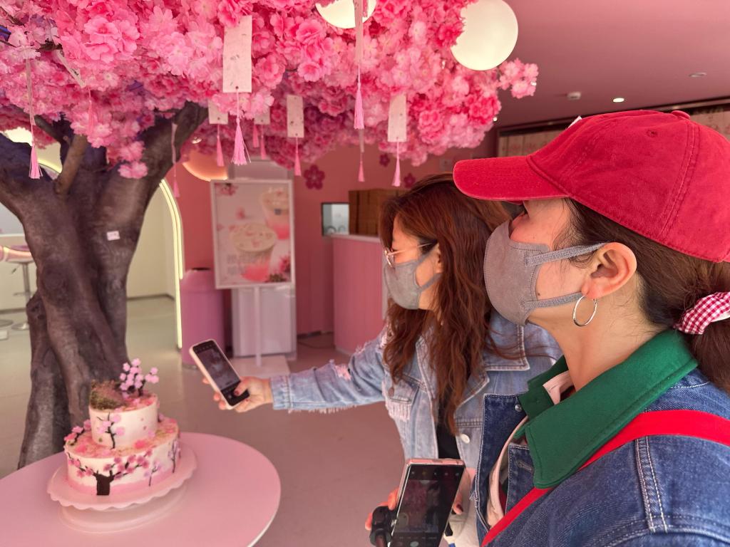 遊客“打卡”北京市玉淵潭公園內的甜品店。