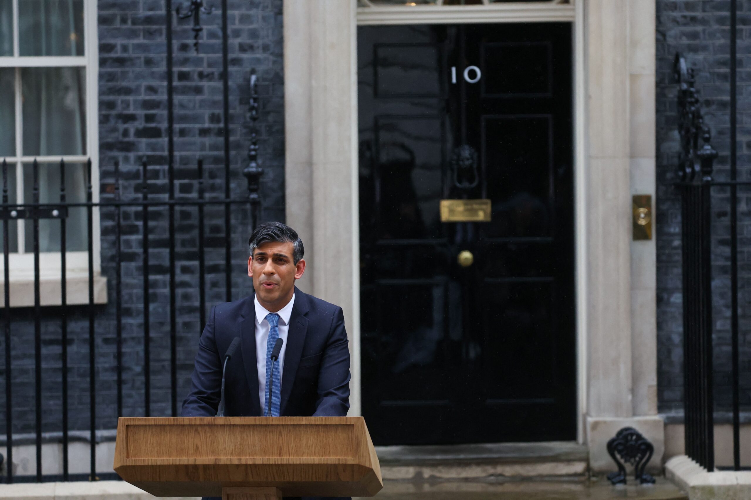 44歲的蘇納克冒著大雨站在唐寧街辦公室外,結束了人們對他何時將舉行新一輪投票的數月猜測,比預期提前數月宣佈舉行選舉。
