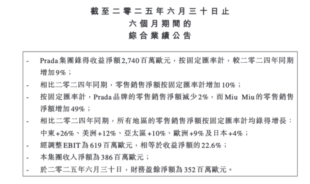 普拉達旗下Miu Miu的零售銷售淨額同比增長49%,集團預計對範思哲的收購下半年完成。