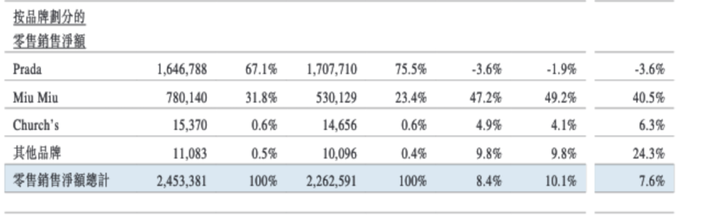 從旗下品牌表現來看,財報指出,按固定匯率計,Prada品牌的零售銷售淨額減少1.9%,Miu Miu的零售銷售淨額增加49%;Church’s增長4.1%。上半年,Prada的零售銷售淨額為16.47億歐元,Miu Miu為7.80億歐元,Church’s為1537萬歐元,其他品牌為1108萬歐元。