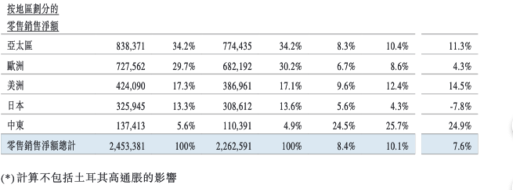 分地區看,相比2024年同期,普拉達集團所有地區的零售銷售淨額按固定匯率計均錄得增長。亞太區是普拉達集團銷售額最大的市場,零售銷售淨額增加10.4%,2025年各季度增長趨勢相近,而區域內的市場情況大致不變。歐洲的零售銷售淨額增加8.6%,表現良好。該地區數年來比較基數較高,今年第二季度受到遊客消費減少的影響,當地需求大致穩定。美洲的零售銷售淨額增加12.4%,在當地及遊客需求的帶動下,第二季度有所改善。受遊客消費增速放緩影響,日本的零售銷售淨額增加4.3%,當地需求穩健。中東的零售銷售淨額同比增加25.7%,該區域各季度增長趨勢相近且穩定。