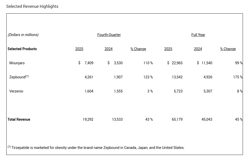 當地時間2月4日,美國禮來公司(LLY.US)發佈2025年第四季度財報以及2025年全年財報。公司第四季度營收192.9億美元,同比增長43%,高於分析師預期;全年總營收達651.79億美元,按固定匯率CER計算同比增長44%,淨利潤206.4億美元,同比增長95%。