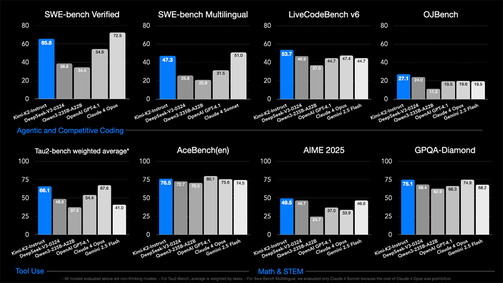 Kimi K2 在自主編程(Agentic Coding)、工具調用(Tool Use)和數學推理(Math & Reasoning)三大能力維度的基準性能測試。 來源:月之暗面