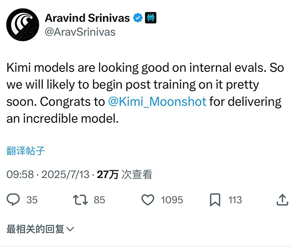 Perplexity的CEO阿拉溫德(Aravind Srinivas)點贊Kimi